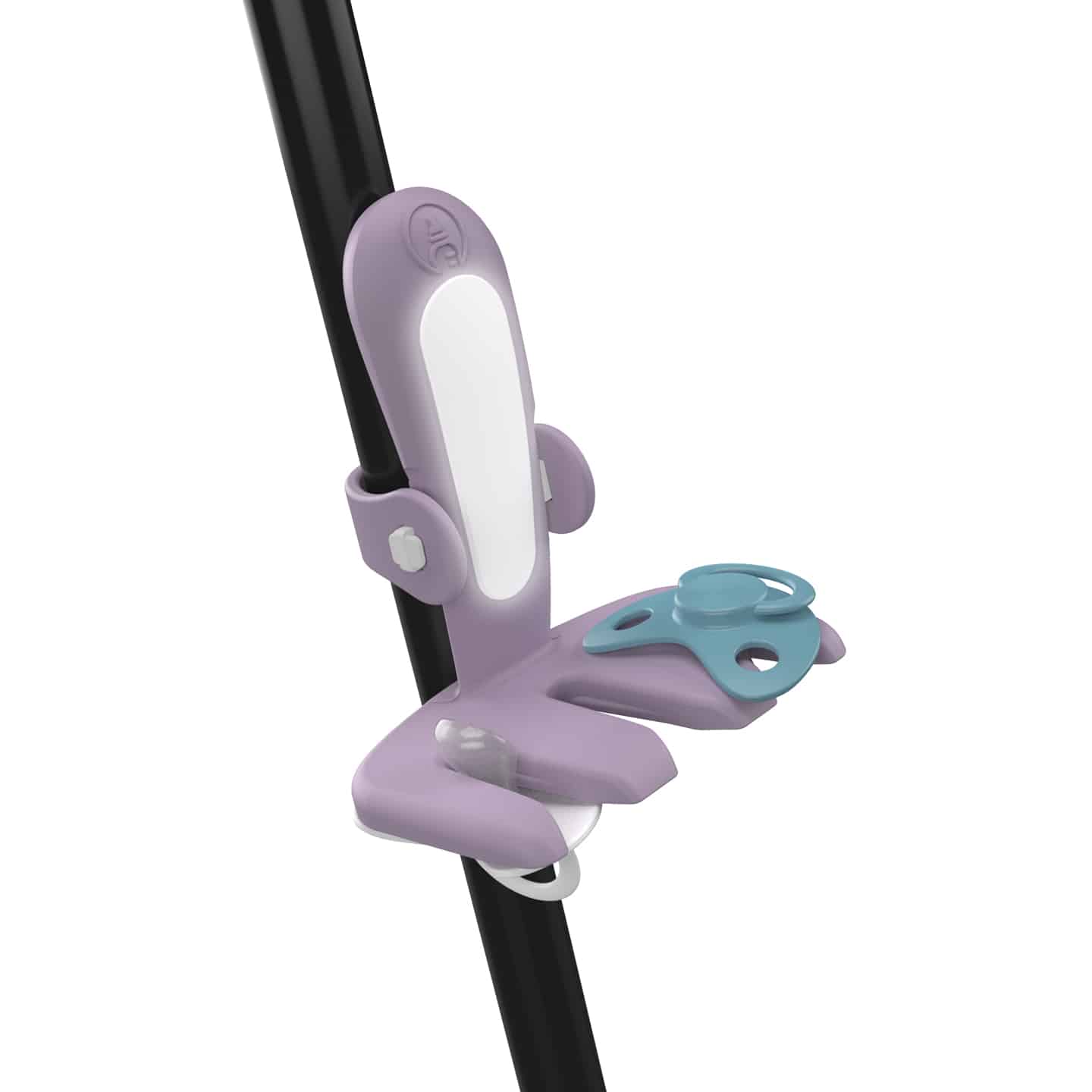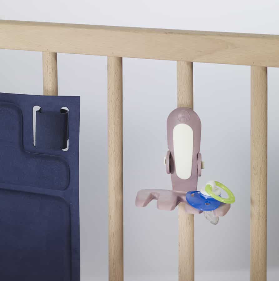 Cet attache sucette se fixe aux barreaux du lit et permet à l’enfant d’accéder facilement à ses sucettes. Cet attache sucette est, en outre, équipé d’une bande phosphorescente ce qui permet à un enfant de le repérer facilement la nuit. Un enfant plus grand peut y stocker ses tétines seul et développer sa motricité et son autonomie en les attrapant lui-même.